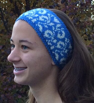 Every once in a while, I get “hooked” on something, checkerboards, stripes, snowflakes, flowers, crazy bright colors are just a few of my knitting phases that come to mind. This design season I am obsessed with snow. Found in a book of traditional fair isle motifs, I have adapted these as allover designs on a hat, a Christmas stocking and now on a headband for a niece. They remind me of one of those beautiful snowfalls, gentle winds, big flakes creating swirls against the night sky, catching a snowflake on your tongue.