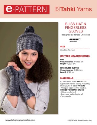 Tahki Yarns Bliss Hat & Fingerless Gloves PDF is a Knitting pattern by Teresa Chorzepa, available as a Downloadable PDF. Super fun to make, this pattern could be your next masterpiece!