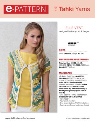 Tahki Yarns Elle Vest PDF is a Crochet pattern by Robyn M. Schrager, available as a Downloadable PDF. Super fun to make, this pattern could be your next masterpiece!