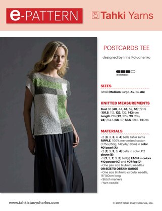Tahki Yarns Postcards Tee PDF is a Knitting pattern by Irina Poludnenko, available as a Downloadable PDF. Super fun to make, this pattern could be your next masterpiece!