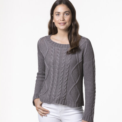 Tahki Yarns Sombra Pullover is a stunning all-season pullover, loaded with design details. The front features both classic cables and textural diamond cable panels. Coordinated cables grace the sleeves, while the moss stitch back features an unexpected “fishtail” effect. Knit in Tahki Yarns Malibu 100% mercerized worsted weight yarn with a tape-like, knitted construction, making it airy and light.