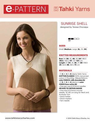 Tahki Yarns Sunrise Shell PDF is a Knitting pattern by Teresa Chorzepa, available as a Downloadable PDF. Super fun to make, this pattern could be your next masterpiece!