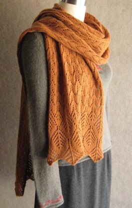 Elaborate lace "feathers" at the ends flow into the smaller feathers of the main pattern. Knit in 2 pieces and grafted. Pattern contains instructions for both a shawl size (shown in sage and curry) and a scarf size (shown in petal)