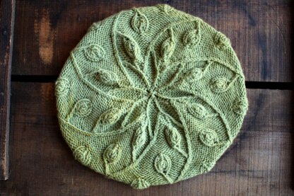 A textured, slouchy hat featuring sprouting vines growing up and out from the bottom ribbing. Taking Root is knit in the round from the bottom up.
