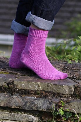 A delicately patterned sock that uses short rows to create the toe and heel. A gusset has been added also at the instep as I find that socks with a gusset have a better fit. If in doubt about size drop down to the finished circumference just smaller than your foot circumference. Socks fit nicely with a little negative ease so they are not baggy. Adjust the foot length to fit your actual length for a good fit.