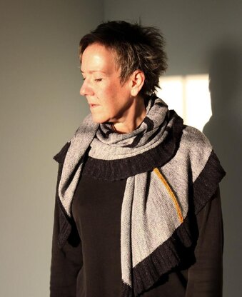 A solid wrap with bold, graphic lines, Tanjong Pagar is worked sideways in wedges divided by contrasting spokes and a ruffled edge is worked in intarsia as you go.