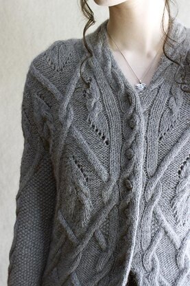 Construction: The sweater body is knitted flat from the bottom in one piece to underarms, then knitted separately as two fronts and a back. The cabled buttonband is worked as part of the sweater body, then continues as a narrow band around the neckline. Buttonholes are worked as eyelets within the front cable. Sleeves are set in.