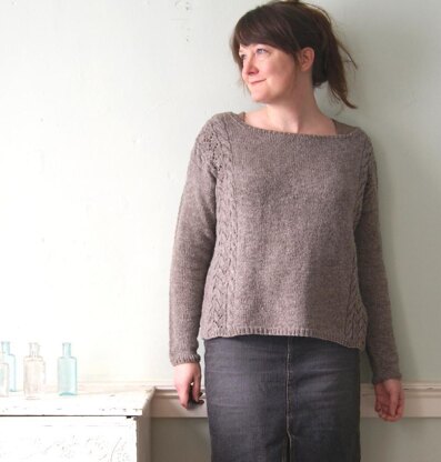 Teakwood pullover is worked from the bottom up, in stockinette stitch, with cable and lace panels worked up the sides on each front and back. Stitches are picked up around the armholes for the sleeves, so the only seaming is at the shoulders. It is designed to be worn with 8" to 11" of positive ease as a comfy over-sized sweater. I used Woolen-Spun Fingering weight yarn in Medium Grey from Elsa Wool Company which provides beautiful drape and makes for a super soft knit! The jumper is pictured with 9 inches of positive ease. Alternative yarn is suggested but always take time to save time and check your gauge.