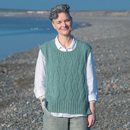 The Laguna Veneta Vest from The Fibre Co.’s Almanac Series III is a versatile vest with a waving texture pattern adding a nod to the sea. Lore yarn ensures that your vest will be lightweight yet warm with its lofty, woolen-spun Romney wool offering beautifully heathered shades to choose from. The Laguna Veneta Vest is knit seamlessly from the bottom up, beginning with the hems which are knit flat to create the side vents before joining to work the remainder of the body in the round to the underarms. The back and front are completed separately before joining at the shoulders with a three-needle bind-off. Ribbed trims at the neck and armholes provide tidy finishes and have your Laguna Veneta Vest ready to layer over tees, buttondowns, or dresses with ease and timeless style. Stitch pattern is both charted and written out.