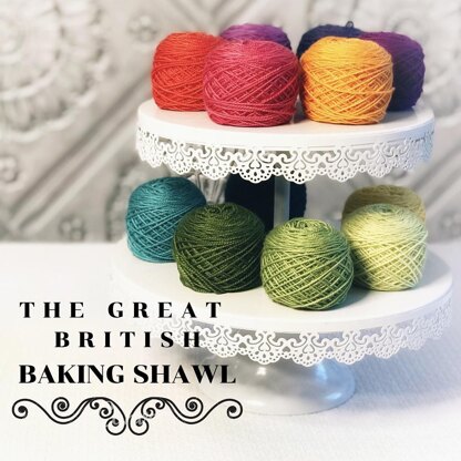 An homage to The Great British Baking Show ("Bake Off" is under another copyright in the U.S.), this Mystery Knit-A-Long is gluten-free, campy, and lots of fun! Each clue omes with a recipe or baking tip, and you enjoy knitting a shawl with many layers and no soggy bottom.