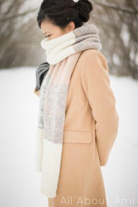 The Longbourn Scarf is an elegant and gorgeous statement scarf that is knit using 3 different shades of Touch of Mohair yarn! The neutral and modern colourway makes this scarf a classic in any wardrobe as it can be worn over different coats. Minimal ribbing is worked on either end with the majority of the scarf knit in relaxing stockinette stitch. The extra width and length give the Longbourn Scarf a cozy feel as it can be looped around the neck for added warmth! The finished dimensions of the Longbourn Scarf are 20" wide (stretched)/16" wide (unstretched) and 95" long . The printable PDF is a total of 4 pages including the cover page. PDF is in ENGLISH ONLY!