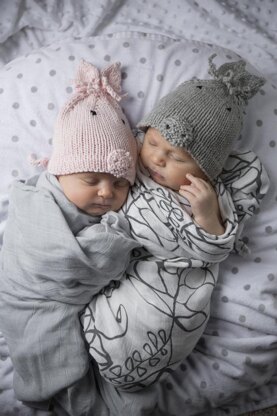 A superfast sweet knit with two ears, a snout and a curly tail! Hat is worked in the round; ears are worked separately on double pointed needles as part of the decrease. Snout and tail are knit separately and stitched on. Bows are constructed with a crocheted chain. Sizing implies stretching for a snug fit; size up if you prefer a looser fitting cap.