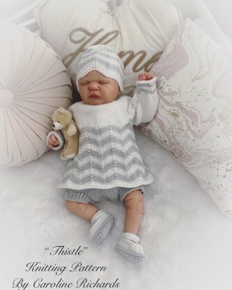 This pattern provides the instructions to make this beautiful 4 piece set. The top can be worn the other way around as a cardigan. It is knitted from the top down, so minimum sewing. giving it a seamless look. the short, hat and shoes perfectly compliment the outfit.