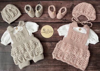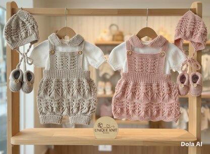A multi piece knitting pattern for a Dungaree and Dress set worked in a pretty textured stitch.