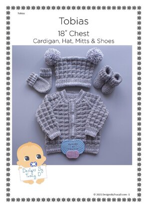 Tobias is a Baby Knitting Pattern suitable for a boy or a girl and has a cardigan, square pom pom hat, booties and mitts and it is to fit a baby 18" chest (finished size) It is made using DK yarn with 3.35mm & 4mm needles, and has a simple 6 row pattern. The full set will need 200g of DK yarn.