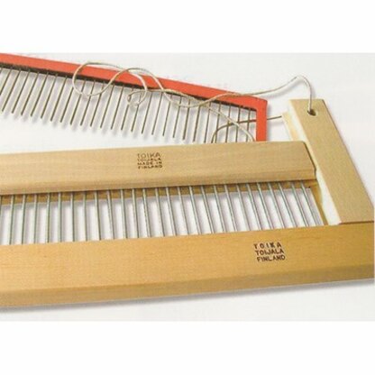 A Toika Raddle is an open reed, which is inserted in the beater for beaming. It is suspended from the back side of the castle with cords when beaming. Raddle height without cape is 10.5cm (4⅛") and 13.5cm (5⅜") with cape. The distance between pins is 1 cm (3/8"). Available now in 2 sizes: 100cm (39⅜") and 120cm (47¼")