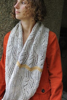 Tonic water is an airy lace cowl with a simple, but unexpected pop of color. The undulating lace pattern is gorgeous in the soft, delicate yarn, and the scarf is a quick and easy knit. As always, easier than it looks!