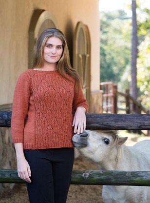 This beautiful pullover is a very satisfying knit. It's worked from the top down, in the round, so there's no seaming. The front and back are the same, with waist and hip shaping for a better fit. The sleeves are picked up and worked down from the armhole to a 3/4 length; if you'd like a longer sleeve, just work an even number of additional decrease rounds and change to ribbing when the sleeve is about an inch from your desired length. The cable and lace pattern is interesting and engaging, and is presented in both written and charted versions.