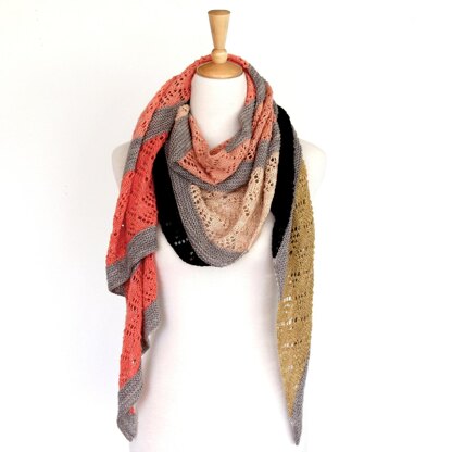 Torquata is named for the Eucalyptus Torquate or Coral Gum, an Australian species with beautiful flowers in coral pink shades, a colour theme represented beautifully by Miss Babs yarn who have created the perfect gradient set for this design. Use a gradient set or mix and match mini skeins for a fun project in both the planning and knitting stage and will be a perfect way to use up some of those partial skeins in your stash too. Knit on the bias, resulting in an asymmetrical wrap that is easy to wear in a variety of ways. The simple lace makes for a perfect first lace project or a relaxing knit for a seasoned knitter.