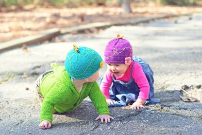 This adorable pattern set includes two projects, the girly Butterfly Trail Cap and the unisex Bumblebee Trail Cap. Both projects are based with a simple hat design. Embellishments are knit separately and then stitched to the hat alongside the trail.
