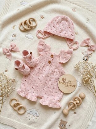 A pretty romper pattern with a matching bonnet and shoes. Knitted on straight needles back and forth with line-by-line instructions. The romper is knitted from the top down, so minimal sewing is needed. It buttons up with 2 buttons on the back but can be worn with the buttons on the front. The bonnet is also knitted from the top-down and the icord ties can be added without any sewing required. The little shoes are quick to knit up and complete this beautiful little set