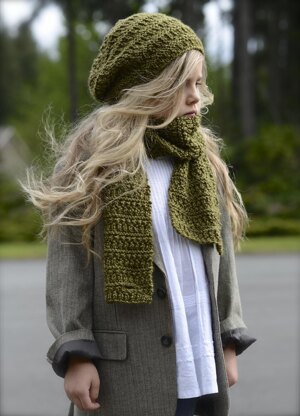 Pattern includes a scarf and two hat options (beanie or slouchy style).