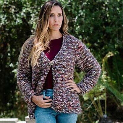 Slip Stitch Cardigan from Trendsetter Yarns is a fun and squishy warm women’s v-neckline sweater knit in Me and Dune. The cardigan is knit flat in pieces from the bottom up and then seamed. It is finished with a row of single crochet and a row of reverse single crochet along the front neck edges. Trendsetter Yarns Dune is a beautiful mix of mohair, nylon, and acrylic. The multicolored mohair is accented with a fun touch of sparkle.