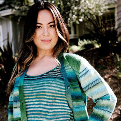 Purl Ridge “V” Cardigan from Trendsetter Yarns is a lovely striped women’s v-neckline cardigan with set-in long sleeves knit in Candyland and Nuance. The cardigan is knit flat in pieces from the bottom up and then seamed. Trendsetter Candyland is a fluffy, self-striping, lightweight yarn constructed from a nylon tube with Merino wool blown in, and it’s available in a wide range of fun colorways.