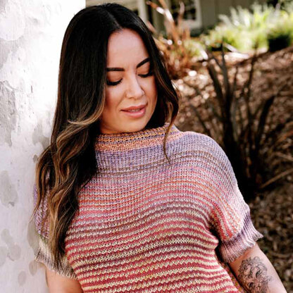 Trendsetter yarns Slipped Stripe Tall Collar T-Shirt is a fun and colorful oversized women’s pullover knit in Nuance. This sweet sweater is knit flat in pieces from the bottom up and then seamed. The collar stitches are picked up along the neck edge and worked in the round seamlessly. The bottom edge is finished with a row of single crochet and a row of reverse single crochet. Trendsetter Yarns Nuance is a color-changing cotton yarn. Nuance has beautiful colors that are so nice to look at and work with!