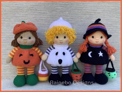 These darling Trick or Treat Dolls with their Trick or Treat Bags and removable costumes are knit in the round, (Intermediate Level), using Magic Loop (or double pointed needles). They are approx. 12 ½” tall (without hats) and are created using #3-light wt. (DK wt.) yarn and size 3 (3.25mm) 32” Circular Knitting Needles (if using Magic Loop). The legs, body, arms, and head are all knit on as you work along.