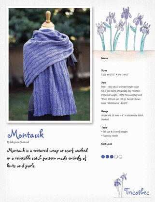 Montauk from Tricotbec is a textured wrap or scarf worked in a reversible stitch pattern made entirely of knits and purls. It produces a very warm wrap or scarf, for very little effort. Both a scarf and wrap size are included in the pattern.