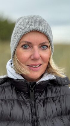 It has a double brim where the Italian cast-on is knitted together at the top. This makes the brim nice and elasticated. There is a sec-ond way to wear it on colder days by folding the brim again.
