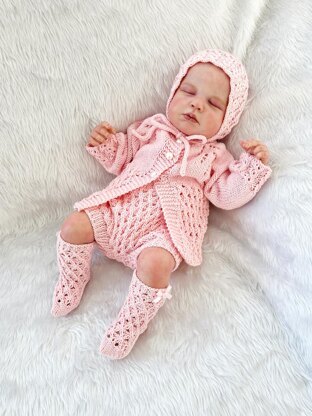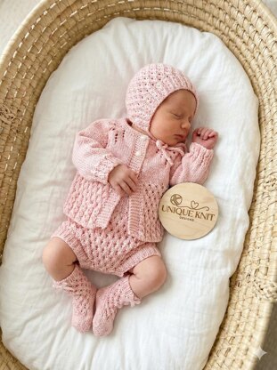This pattern provides the instructions to make the cardigan, pants, bonnet, and little socks. All 4 pieces are knitted flat on straight needles and knitted from the top down to eliminate the need for lots of sewing and also creates a more seamless finish making them nice and comfy if worn by a baby