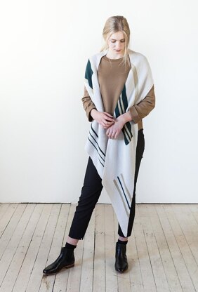 **Modern minimal lines emerge in this sumptuous garter stitch scarf as color blocking is worked on a bias with a bit of intarsia. Arranged in an unexpected pattern that gives this stylish accessory a modern angle.**FINISHED MEASUREMENTS