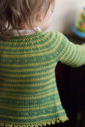 This child’s cardigan is worked in one piece from the bottom up. The sleeves are worked separately and joined to the body before working the yoke. Button bands are picked up along the front edges and worked in garter stitch. The sleeve and bottom hems have a picot edge. The picot is created in the cast on. Eliminate the picot edges to create a boy's cardigan.