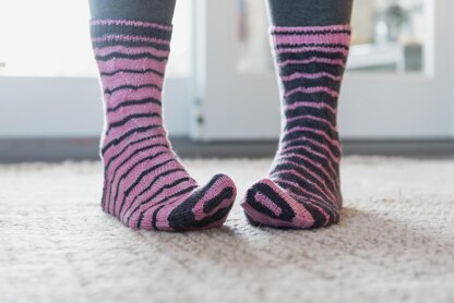 Much like the iconic twins themselves, Tweedle Toes creates an odd pair of socks, perfectly matched to be mis-matched. These top-down socks use simple increases and decreases to create unpredictable ripples in your favorite self-striping yarn. To get the full effect, use Fibernymph Dye Works Inversibles—half skeins of two-colored stripes dyed as opposites. Ready for a bit of an adventure? It’s time to cast-on Tweedle Toes!