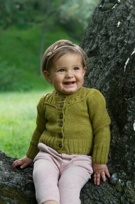 Two branches frame the neckline of this long-sleeved cardigan for little ones. Twiggy is worked in pieces from the bottom up and seamed together at the end.