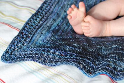 Twinkle Twinkle is a charmingly simple baby blanket or shawl. It is constructed of four triangles knit "in the round" from the centre out to form a square blanket with a starry centre and an understated lace border. It was designed to be plain enough to be unisex but special enough to celebrate any new arrival. It can be knit in either fingering or DK weight yarn depending on the desired effect.