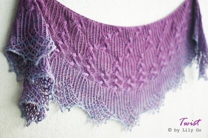 Twist is a long crescent shaped shawl worked from the bottom up. The shawl generous length is perfect for many styling options. This shawl is designed to be knit in fingering or heavy fingering yarns adorned with plenty of beads (if beads are not for you, then you can omit them all together). This pattern has many twisted stitches and cables to create interesting textural pattern, thus the name. Pattern includes charts and written directions.