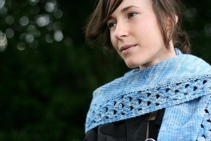 Knit from side to side, this shawlette is edged with a deep waffle pattern that forms an interesting edging for this shallow shawlette. As it is knit in one piece, it is easy to extend so you can make the most of a luxury yarn and use every last ounce. Knit from a worsted weight yarn at a loose gauge, this cosy shawlette can be used in several different ways; wrapped as a scarf or loosened as a shawl in the evening.