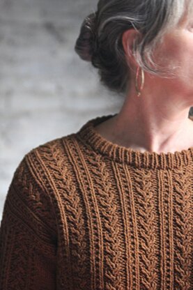 Beautifully delicate yet bold cables and a picot collar add a touch of femininity and some beautiful lines to a classic pullover. Worked in worsted weight yarn in a deep caramel, this sweater also manages to be modern, classic at the same time! It's easily modified for length or width, and notes are in pattern.