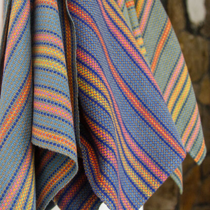 Several bright shades of Brassard 8/2 Cottolin are woven into lively chevron stripes in the Bumberet Towels from Valley Yarns. For this kitchen set you can put on a long warp and and have fun changing up the weft on each towel.