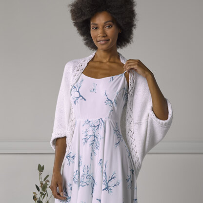 shrug is knit in Montague with fine details such as eyelet lace sleeve and
