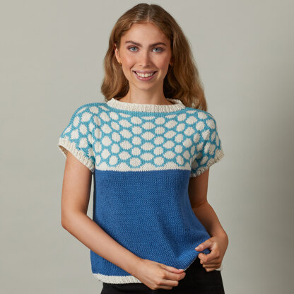 A boxy dropped shoulder top featuring fun stranded colorwork on the yoke, Valley Yarns Juneberry is a great pick for adding to your summer wardrobe. Silky smooth Goshen yarn ensures that you will be cool and comfortable with its blend of cotton, modal, and silk that works up into a fabric with great drape. Knit in the round from the hem to the underarms, sleeve stitches are cast on as well as steek stitches to allow working the colorwork yoke seamlessly in the round. Once the yoke is complete, the sleeve steeks are secured and cut and the back and front are seamed together at the shoulders. Stitches are picked up around the neck and sleeves and ribbed trims are knit in the round for a tidy finish. Colorwork pattern is charted only.
