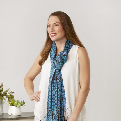 Valley Yarns Blue Highways Scarf is a lush and drapey scarf that is an easy weave, with a design in variegated bamboo that pops against the Tencel strips. It looks like a twill but it’s actually a turned overshot that requires only 1 shuttle to weave.