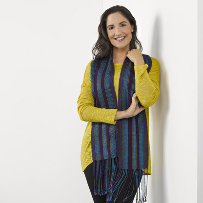 Joanne Wood Peters designs Valley Yarns Royal Columns Scarf. Sparkling gold lines flank columns of blue and purple in this striking scarf. The alternating bands of twill and plain weave make for an interesting design, while the single weft makes this an easy project to