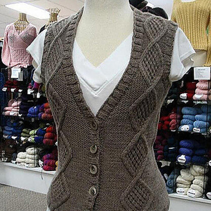 This is the perfect vest for fall with a very classic look, perfect with jeans and a turtleneck or a T-shirt. The v-neck scoops low, lengthening the body, while simple lace and cable motifs create a great line. This vest is worked flat from the bottom up with just two short seams at the shoulders. Note: Cable pattern is in chart form only.