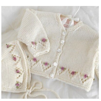 Knit this adorable cardigan and bonnet set for the new baby in your life. The delicate ribbon flowers attached after knitting add sweet detail to this quick-knit baby project. Both pieces are knit flat and seamed.