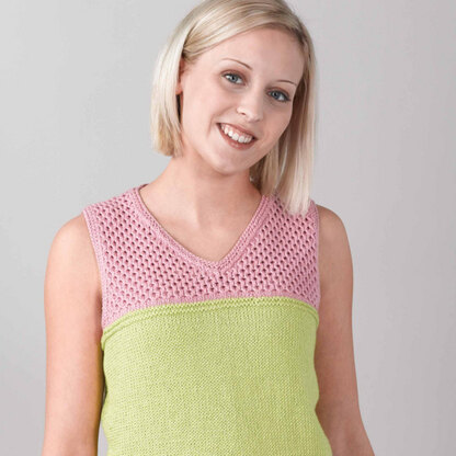 This bright and fun tank top in contrasting colors is made out of comfortable and easy-to-knit Longmeadow. Pick your favorite colors, or stick with the brights shown here — this tank would look beautiful in a solid color as well. Honeydew Tank Top is knit in the round from the bottom up.