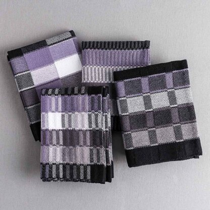Wide stripes of turned twill bordered with thin stripes of broken twill woven in a subtle, subdued palette of greys and purple in Valley Yarns 8/2 Cotton creates a thirsty set of towels for your kitchen or your gift pile. Four different treadlings make each towel distinct, so weave up all four or pick your favorite!